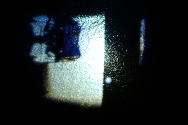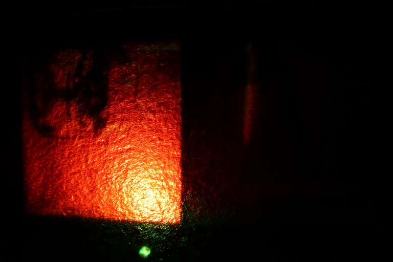 A digital image of a theater light is projected on an absorbent and reflective surface, paper painted in a golden color.