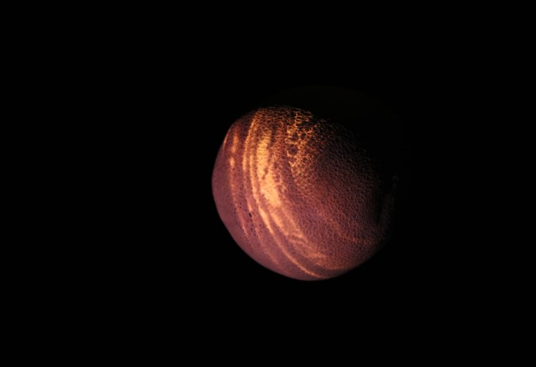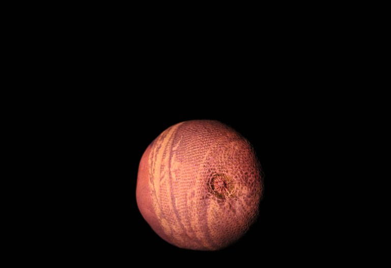 Slides taken from lace wrapped around the skin of a human being, are projected onto a melon.