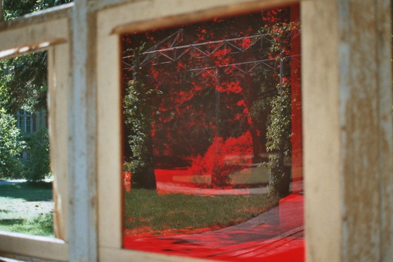 Een andere verschijning verwezenlijkt door dit materiaal, is dat er rode lichtvlekken op de grond ontstaan door het schijnen van de zon doorheen de rode plexi. Naargelang de zon zich verplaatst zullen zich verschillende beelden op de grond aftekenen. Deze steeds veranderlijke rode lichtverschijnselen gaan in dialoog met de vaste structuur van de veranda. Ook bij dit verschijnsel wordt niet alleen het gevangen licht zichtbaar, maar geheel de metalen constructie, haar omgeving en het fenomeen ‘tijd’.